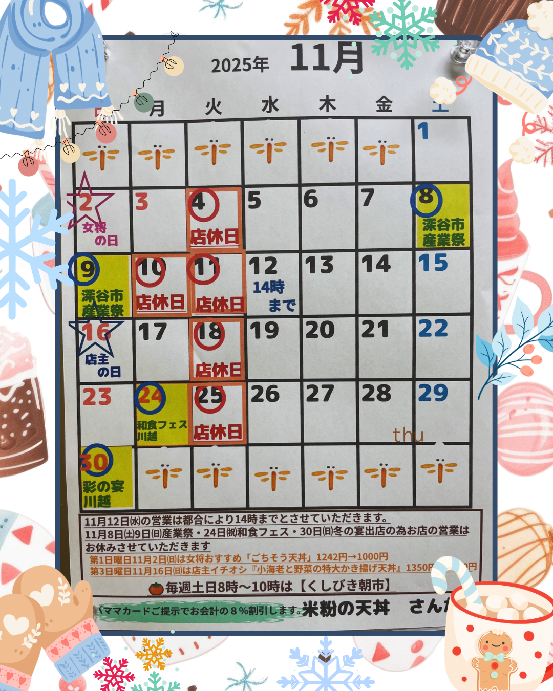 11月16日(日)小海老と野菜の特大かき揚げ天丼1350円→1000円です😊